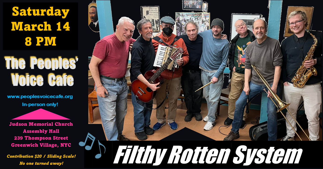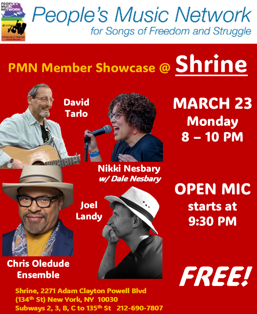 I am thrilled and honored to share the stage with my people’s music network colleagues: the hysterical and dynamic Joel Landy, the exciting Nikki Nesbary, the inspiring David Tarlo, and my Oledude Ensemble mates: Barbara Frankel on flute, Barry Kornhauser on cello, Jonathan Finkelman on bass, and Baba Don Eaton on percussion!