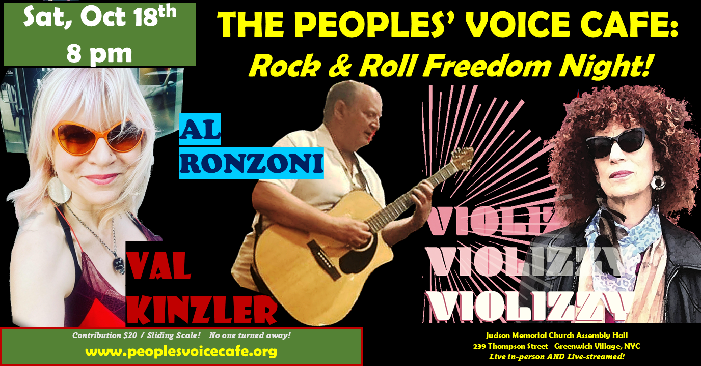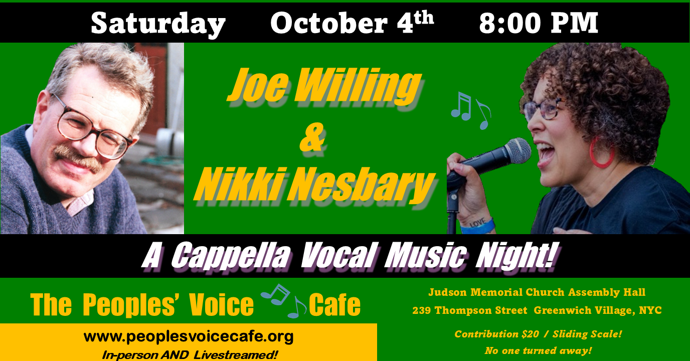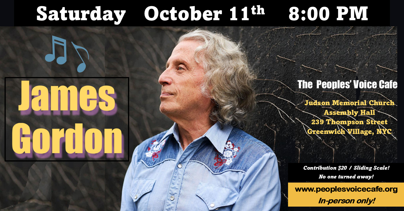 If it’s Saturday night, it must be the Peoples’ Voice Cafe! Most Saturday nights between September and June you will find fans dedicated to quality lyrics and great music at Judson Memorial Church’s Assembly Hall (239 Thompson Street). As a proud member and supporter of PVC, I am happy to encourage you to check out the PVC website and attend (in-person or virtually)! The PVC encourages contributions, but pay what you can; no one is turned away (even on-line!)